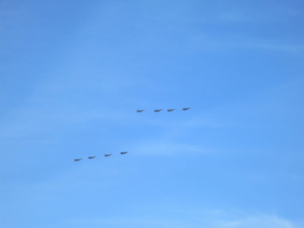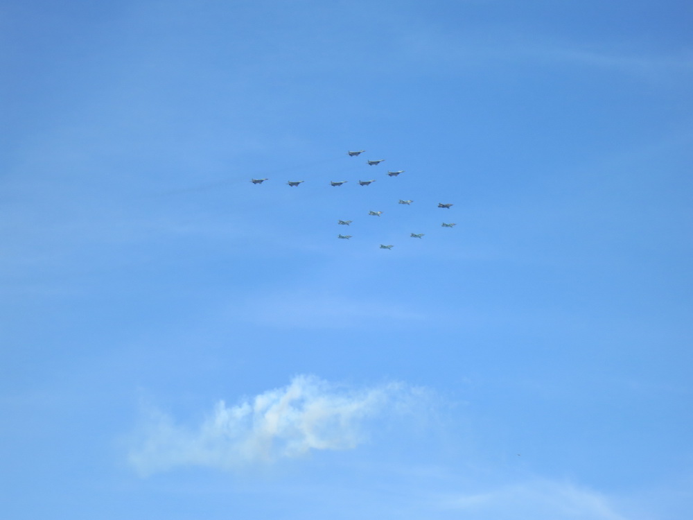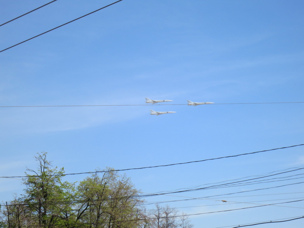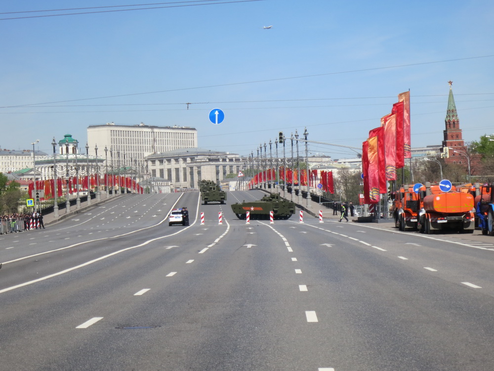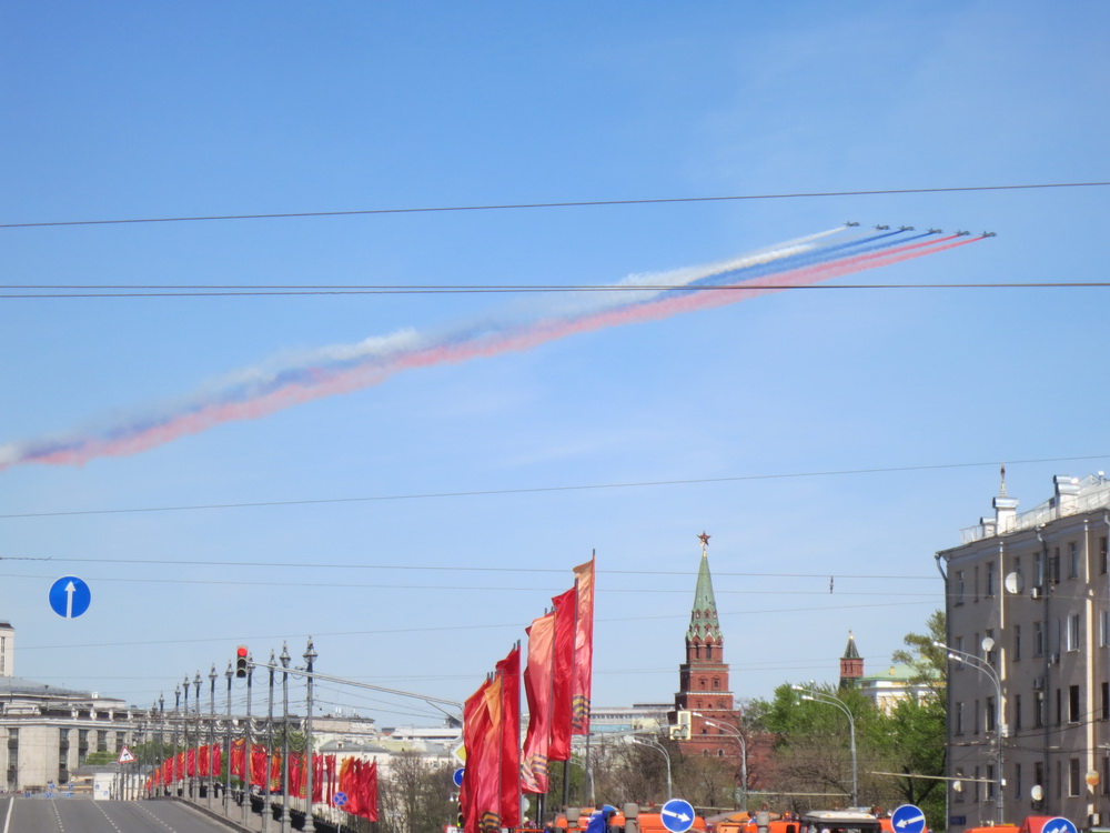 ב 9 למאי השנה חוגגים את יום הניצחון על גרמניה הנאצית והשנה מציינים 70 שנה ליום זה. בצילומי המטס האווירי תוכלו לראות את הסמלים. ביום שהייתי, שהיה יומיים לפני כן, הכיכר האדומה והקרמלין היו סגורים למבקרים והגישה לאיזור כולו נסגרה.
